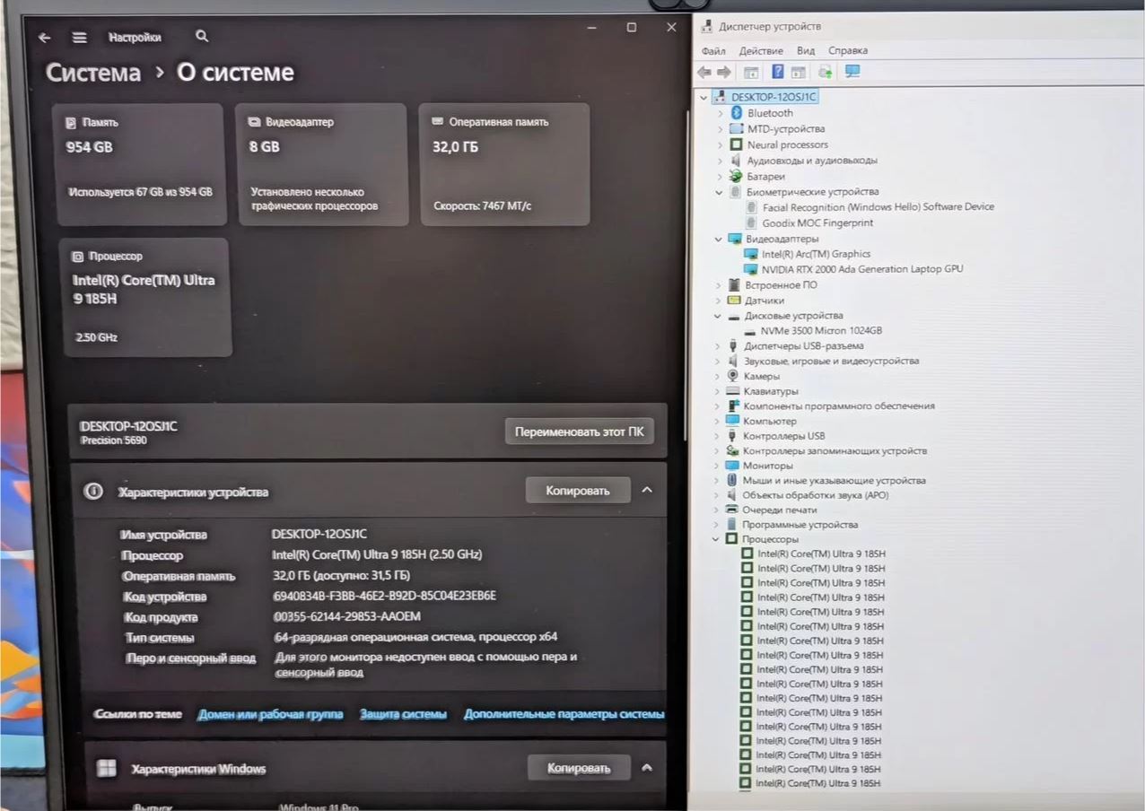 Ultra 9 185H/32GB LPDDR5 7500MHZ/1TB SSD/Quadro 2000 RTX ADA/16 FHD+ матовый.